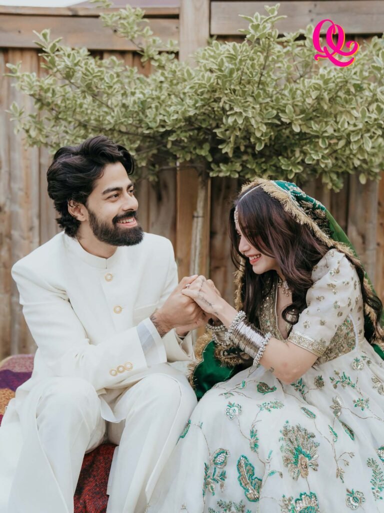 The Aima Baig Wedding pictures reveal a timeless yet modern charm through their attire. Aima wore an intricately embroidered ivory outfit with green accents, paired with a matching dupatta framed in golden detailing. The embellishments shimmered with traditional craft yet carried a soft, understated elegance that reflected her personality. Her silver bangles and delicate jewelry enhanced the look without overshadowing it. On the other hand, Aima Baig Husband Zain Ahmed chose a classic white sherwani with subtle gold buttons, exuding sophistication and grace. Together, their outfits blended tradition with minimalism, making their union not only about vows but also about a cultural statement of style and authenticity.
