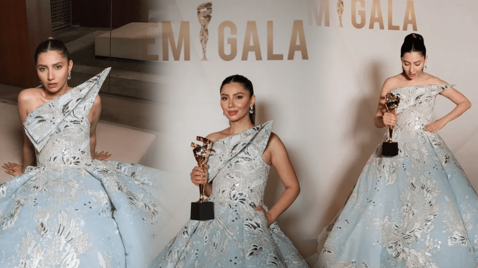 The Emi Gala, known for its celebration of beauty and innovation. Found its highlight as Mahira Khan stepped onto the red carpet. Dressed in a sky-blue gown that cascaded down like a river of dreams. She was the embodiment of grace and sophistication. The strapless dress, adorned with silver floral motifs, was not just a fashion statement but a narrative of her journey in the limelight.