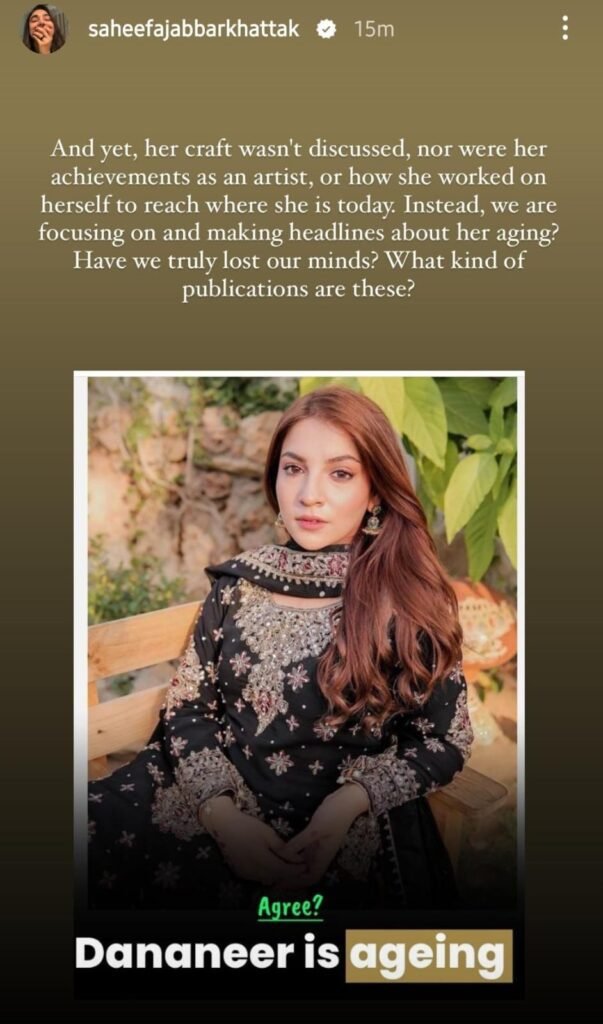 Saheefa took to her Instagram Story to express her frustration, sharing a screenshot of the article along with a compelling message. She wrote, “And yet, her craft wasn’t discussed, nor were her achievements as an artist or her personal growth. Instead, we’re fixated on headlines about her ageing. Have we truly lost our minds? What kind of publications are these?”